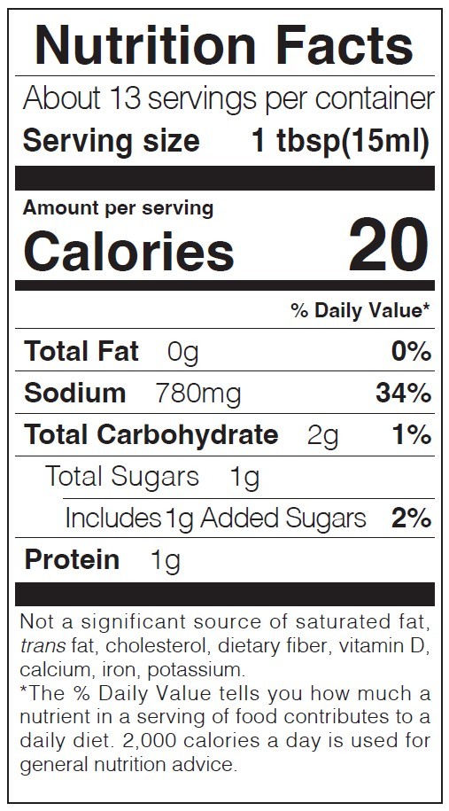 水、小麦、水あめ(とうもろこし、じゃがいも、さつまいも、水)、食塩、脱脂加工大豆、大豆、ぶどう糖果糖液糖、アルコール(日持向上剤)、2%未満の原材料:砂糖、グルタミン酸ナトリウム、カラメル色素、イノシン酸二ナトリウム |